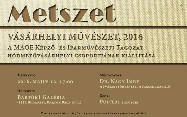 A Magyar Alkotóművészek Országos Egyesülete hódmezővásárhelyi csoportjának nyílik kiállítása május 12-én, csütörtökön 17 órakor Budapesten, a Bartók1 Galériában. A vásárhelyi művészek friss munkáinak bemutatóját Nagy Imre művészettörténész, a Tornyai János Múzeum igazgatója ajánlja a közönség figyelmébe. A vernisszázs vidám hangulatáról a képzőművészekből álló PopArt együttes gondoskodik.